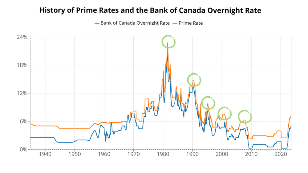 The Bank of Canada adjusts the overnight rate, which influences the prime rate provided by mortgage lenders. On the Graph below you will see there has been 5 large increases in the last 45 years highlighted by the peaks circled in Green. On average, it takes approximately 29.4 months for mortgage rates to hit their peak once they start their increasing cycle. This peak rate typically lasts for around five months before the downward trend starts. After the rates start to decline, mortgage rates rapidly decline. It takes approximately 18.8 months for rates to drop to reach the next lows. In each of the previous rate cycles, the prime rate dropped by over 50% each time.